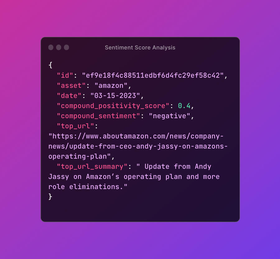 You enter a company's name and we collect all the relevant news articles, blogs and other online published resources on that company. With the help of NLP we are able to calculate sentiment and provide you a consolidated score