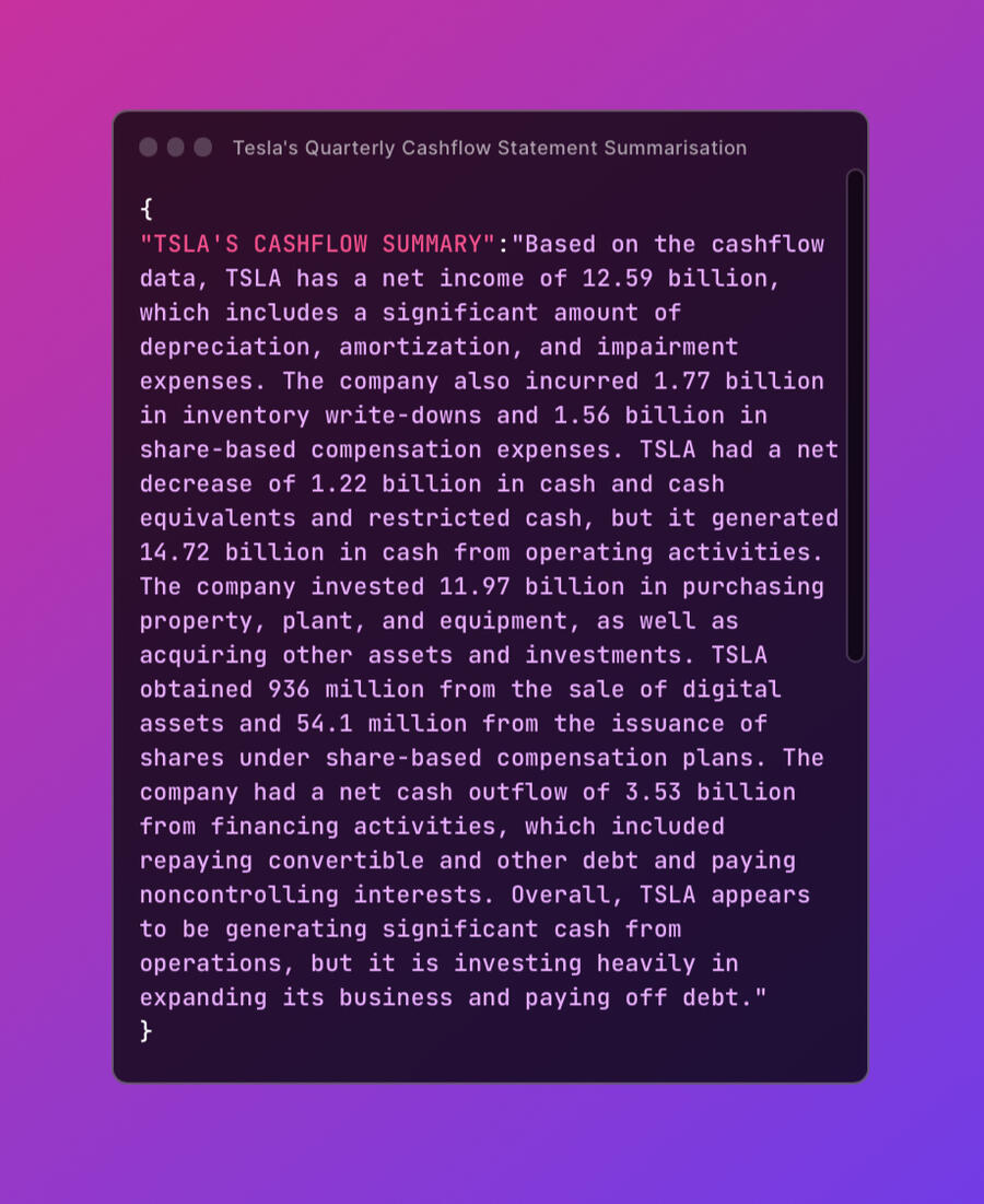 Uses GPT-3.5 to summarize the most recent financial statements of the stock entered. Input any US Stock Ticker Symbol and the desired statement - Balance Sheet, Income Statement, or Cash Flow. In seconds, get a summary overviewing the company's financial status and health.