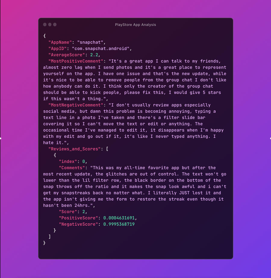 Analyse the reviews of any app on Google PlayStore. This endpoint uses textual emotional classification to differentiate between reviews that are negative and positive and also labels them with calculated positive and negative scores.